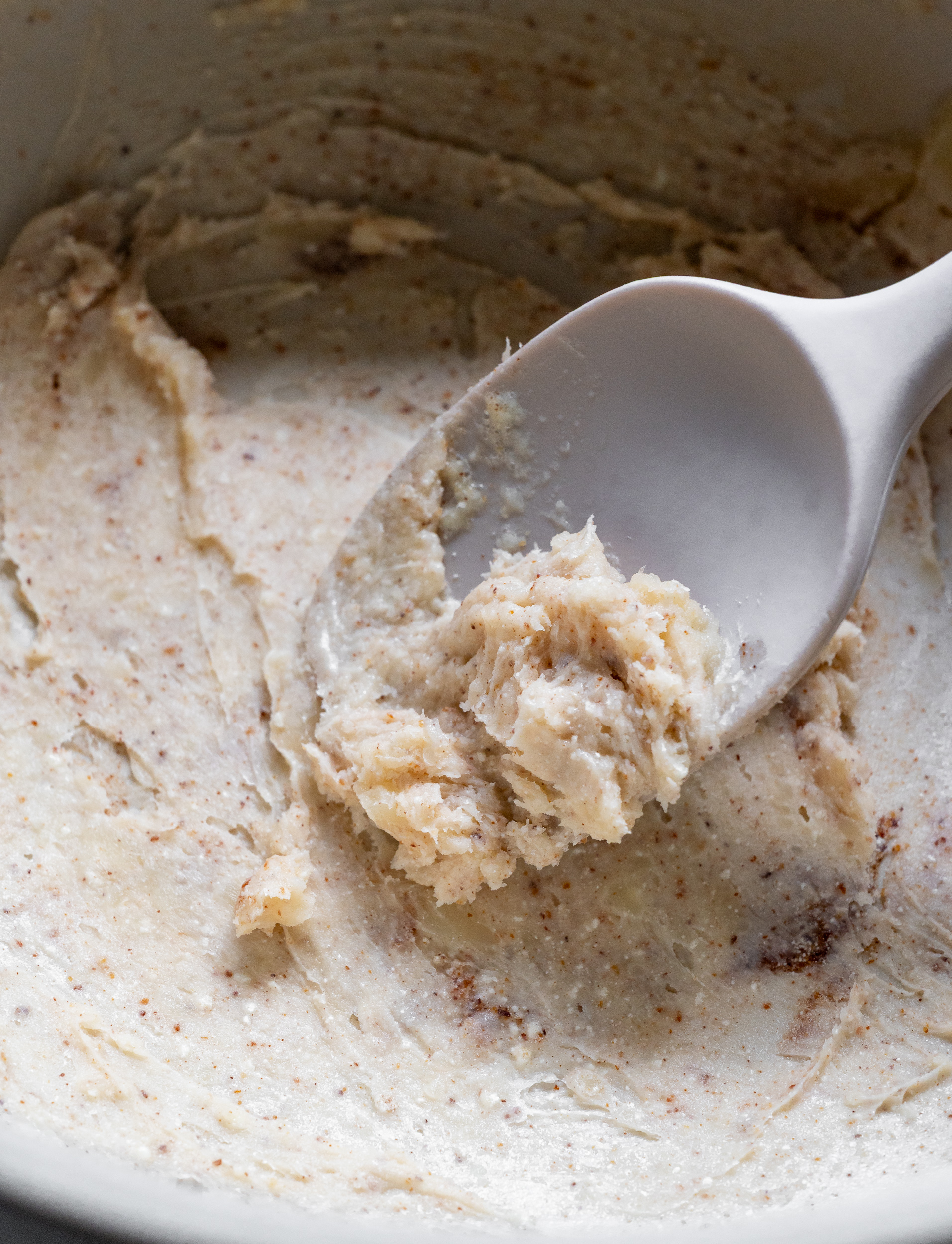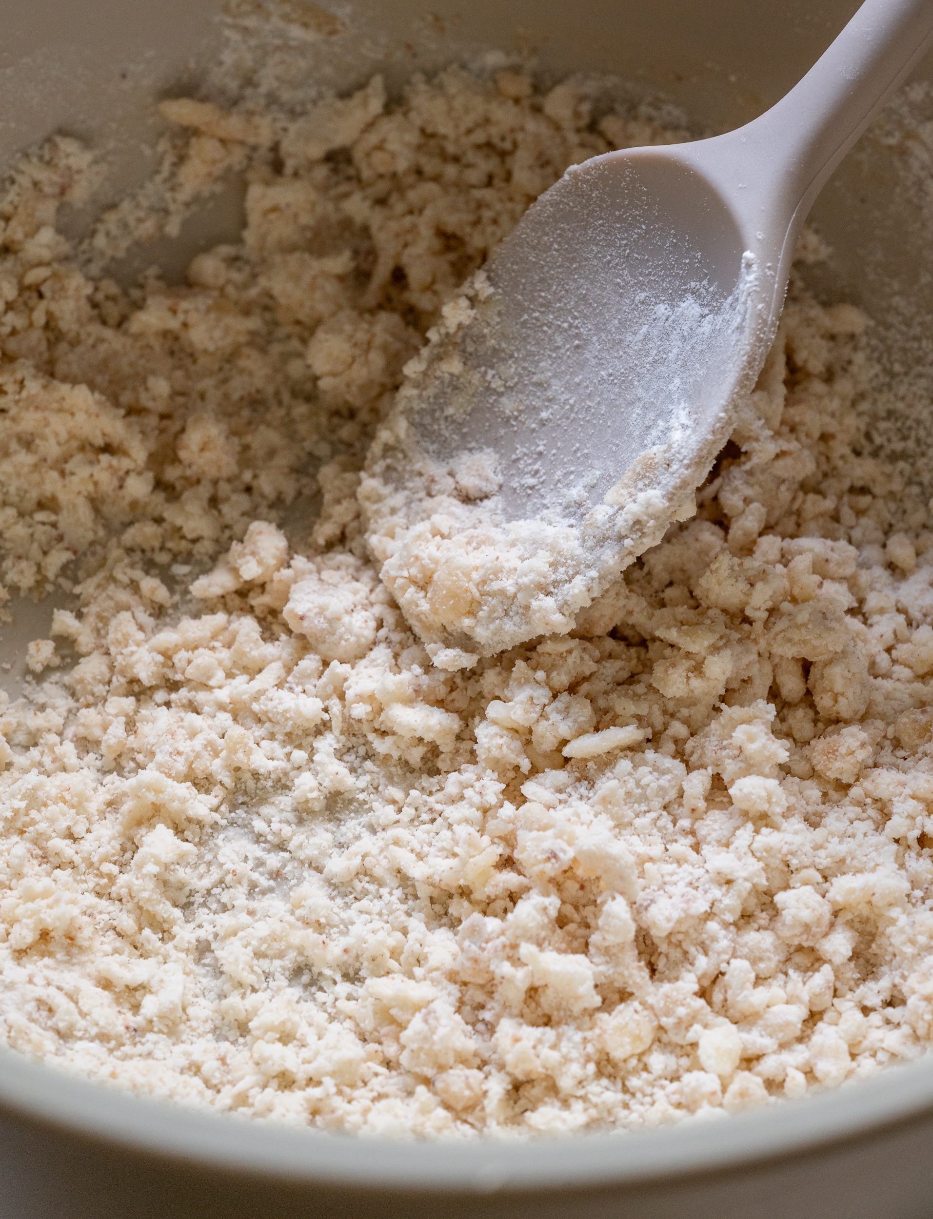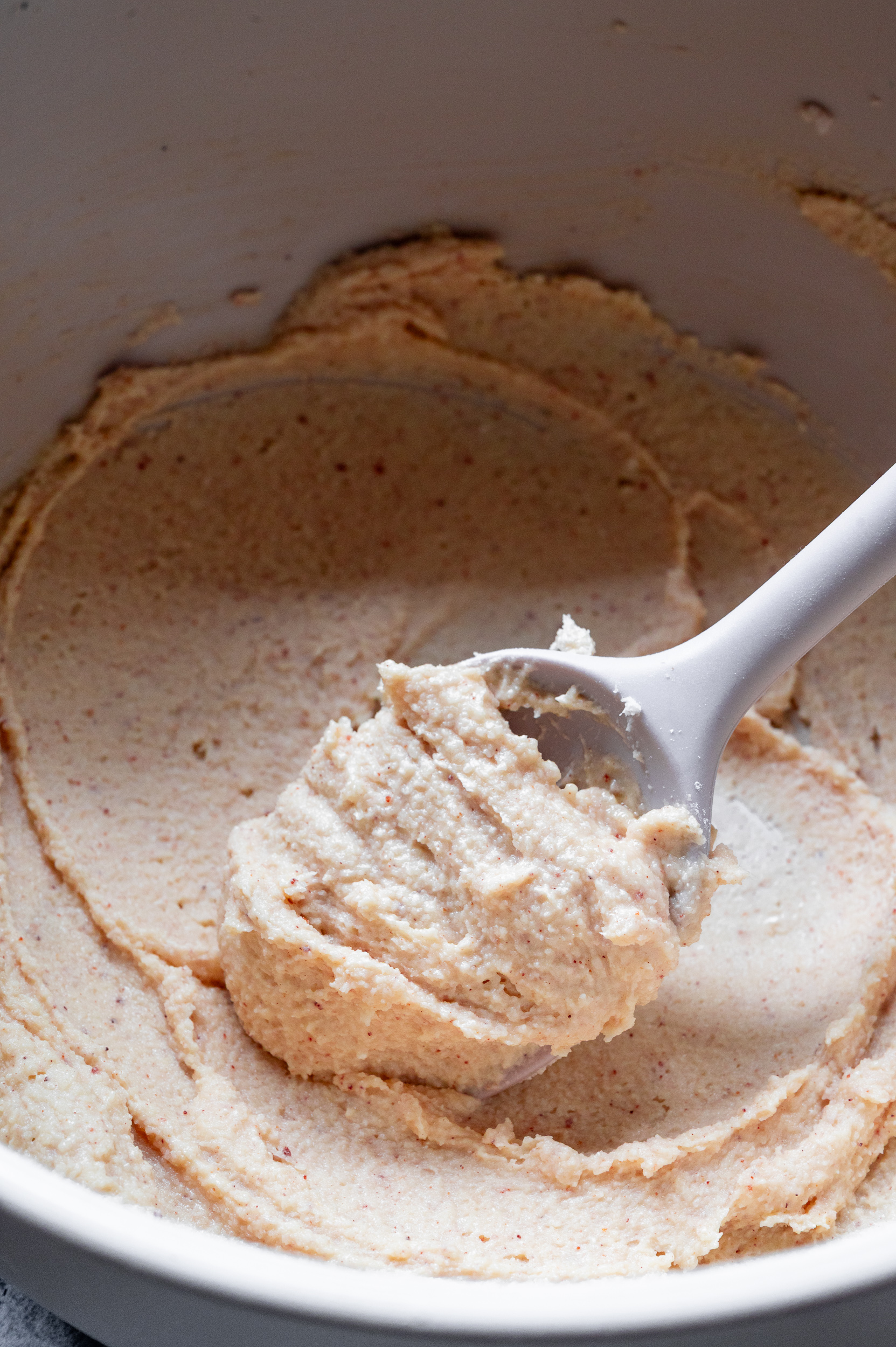 In a bowl to the cooled brown butter add the powdered sugar and mix with a mixer until smooth. It will look crumbly and if it's not smoothing out, use a spatula or the back of a spoon to smooth the butter and sugar. Add the egg yolk, almond and vanilla extracts till combined. Then mix in the almond flour and salt. The texture should be thick and spreadable, like frosting.