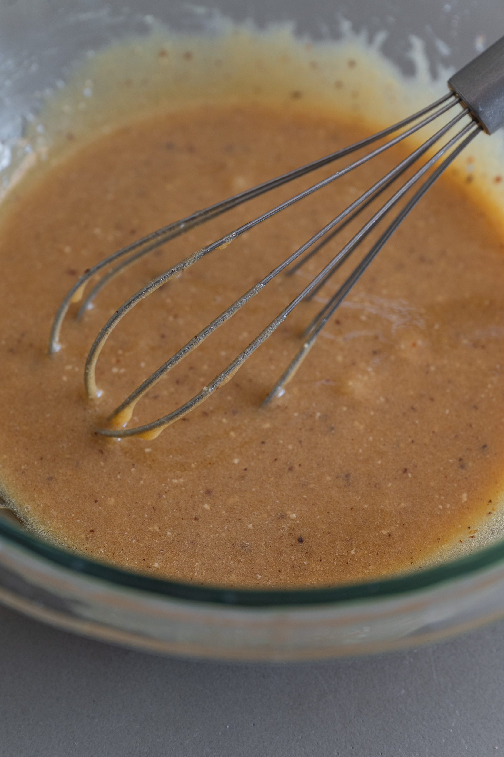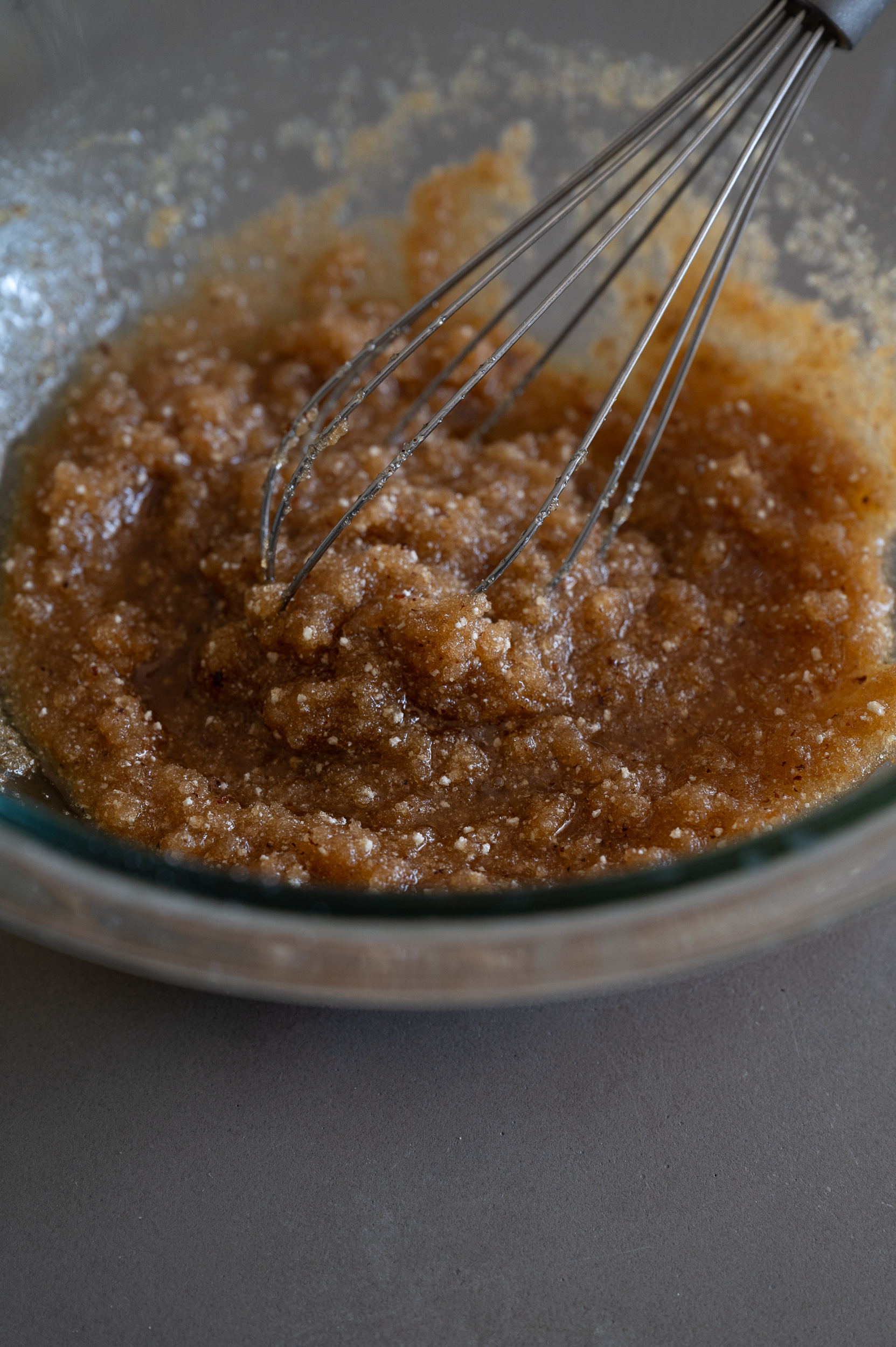 In a large bowl whisk together browned butter (75%), light brown sugar, granulated sugar. Then whisk in both egg and egg yolk and vanilla extract. Whisk until smooth and glossy.