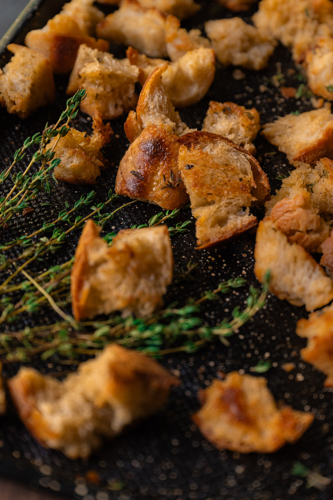 This recipe uses day-old sourdough bread, butter, olive oil, garlic powder, and thyme for the perfect balance of crunch and seasoning. They’re delicious on soups, salads, or even as a snack straight from the pan.